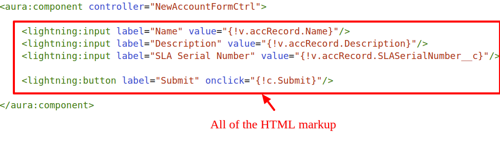 The ‘Component’ stores all the html markup in the aura component and is responsible for the User Interface of the aura component. For example, here is an aura component which creates a form :
