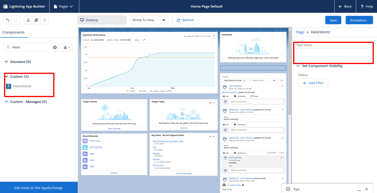 Now, if we use this aura component via the lightning app builder, we should be able to pass the ‘Text Value’ value to it.