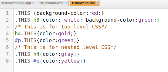 This supports all standard css validators (by class, by id), we just need to use the ‘.THIS’ keyword to apply CSS to the lightning markup. For example :