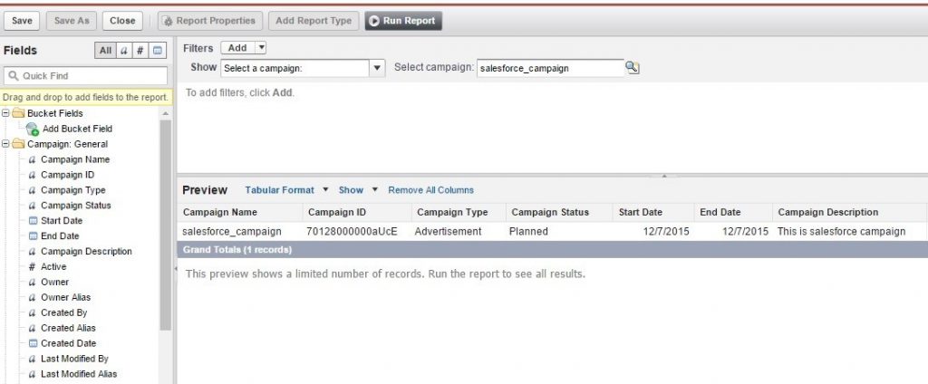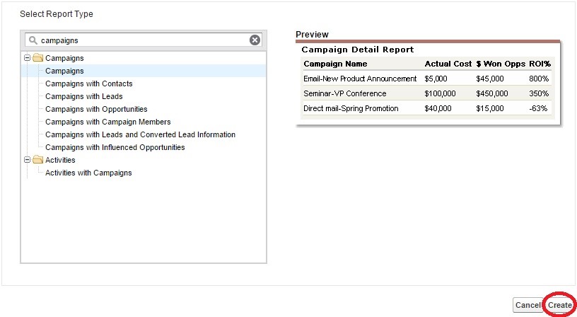 Select an object for which you want to create a Report. Here we are selecting Campaigns object and then click Create button.