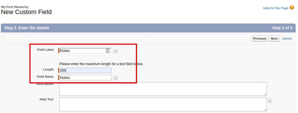 Enter the field name as ‘Notes’ and enter the length as ‘255’ (the max possible length).