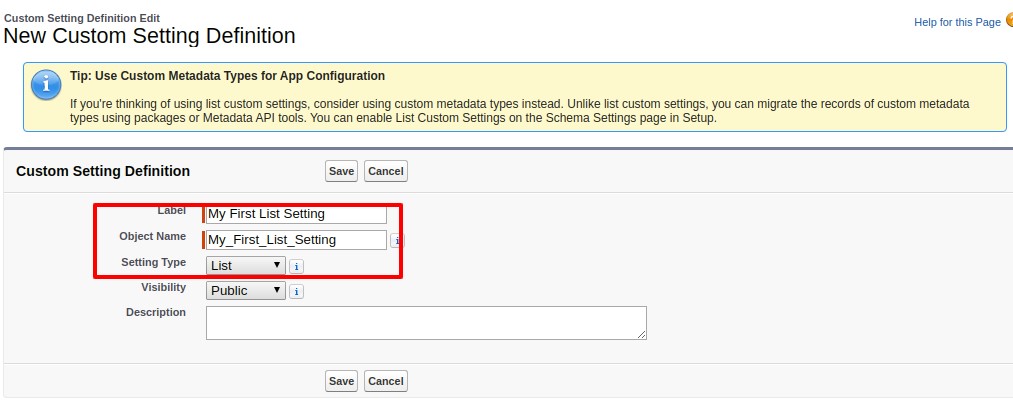 Now, if we want to create a List type custom setting, we can follow the same steps. Let’s create a list custom setting with the name : ‘My First List Setting’