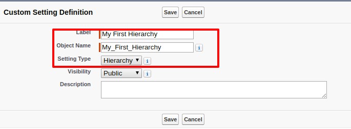 Let’s say we create a hierarchy custom setting with the name ‘My First Hierarchy’ :