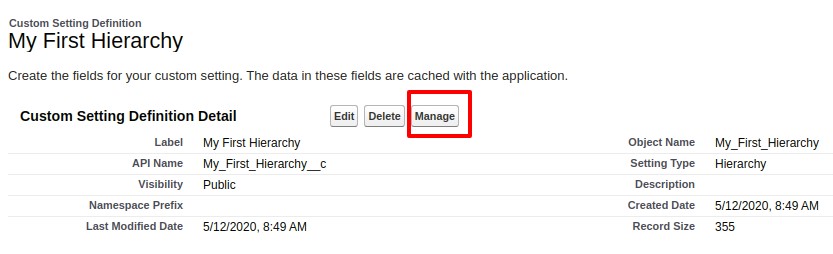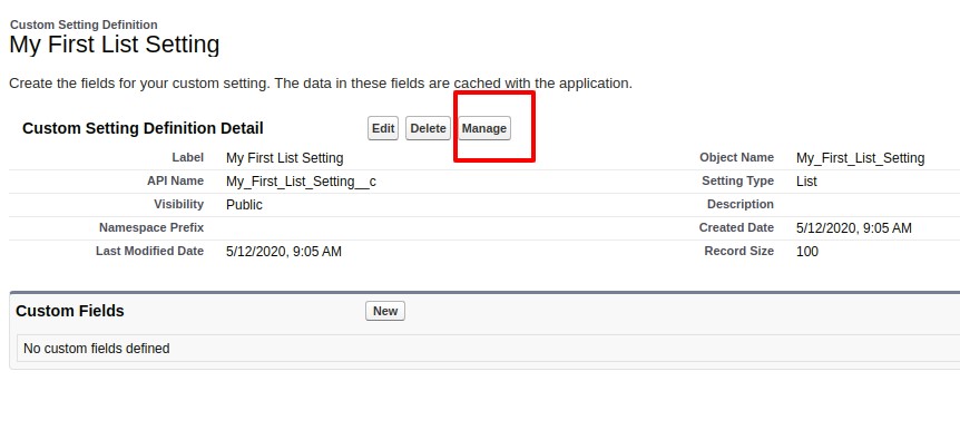 This will create a list type custom setting for us, and just like the hierarchy custom setting, we can use the Manage button to create records for this custom setting.