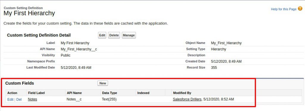 Click on the Save to create this custom setting. This will take to the custom setting screen, let’s create a custom text field on this custom setting called ‘Notes’.