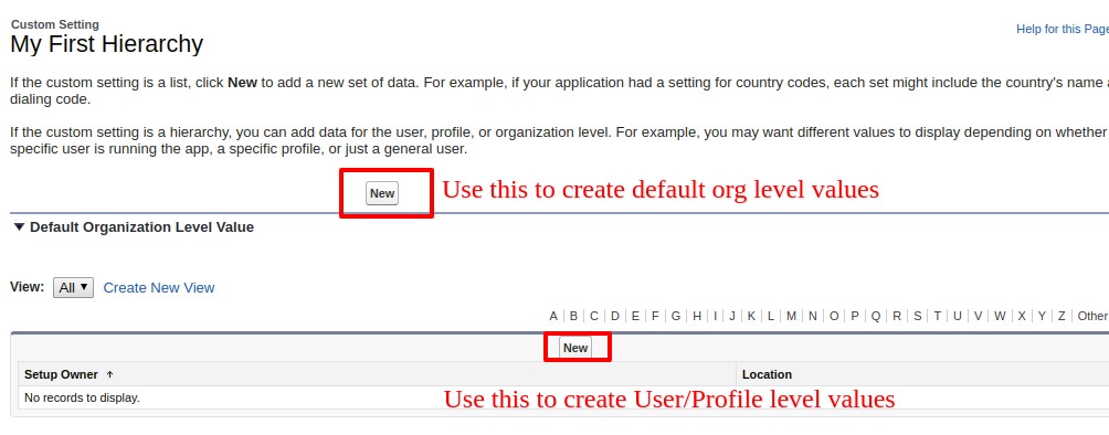 - Hierarchy Custom Settings: These provide a record which is returned on the basis of the logged in user and the profile. This is used when we don’t want multiple records but instead if we want to use a hierarchy structure based on user/profile.