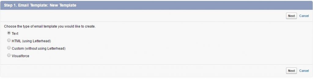 - Text – You can create plain text email templates to send to recipients who cannot read HTML email. All the users can create or change text email templates.