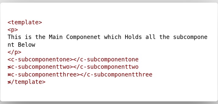 <template> <p>This is the Main Component which Holds all the subcomponent Below</p> <c-subcomponentone></c-subcomponentone> <c-subcomponenttwo></c-subcomponenttwo> <c-subcomponentthree></c-subcomponentthree> </template>