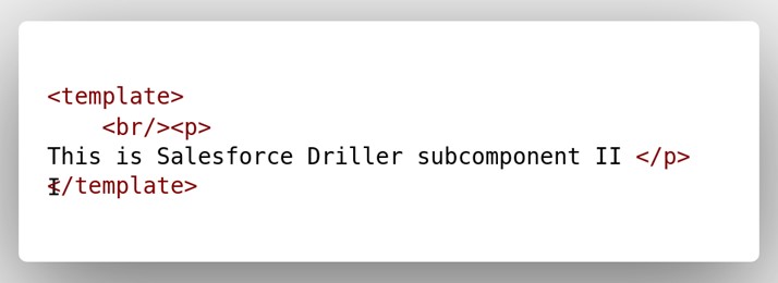 <template> <p>This is Salesforce Driller subcomponent II</p> </template>