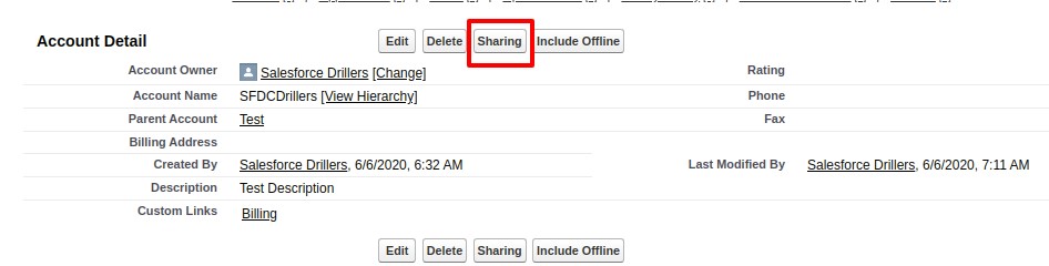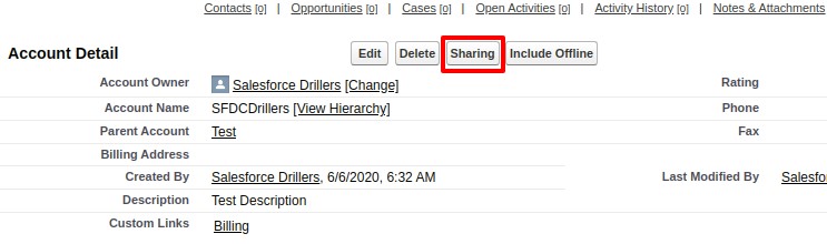 If we want to manually share this record from the page, we can use the Sharing button on the record level.